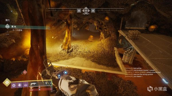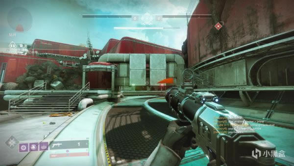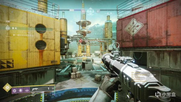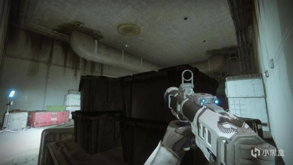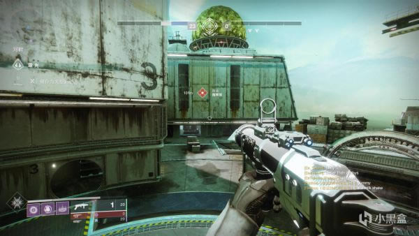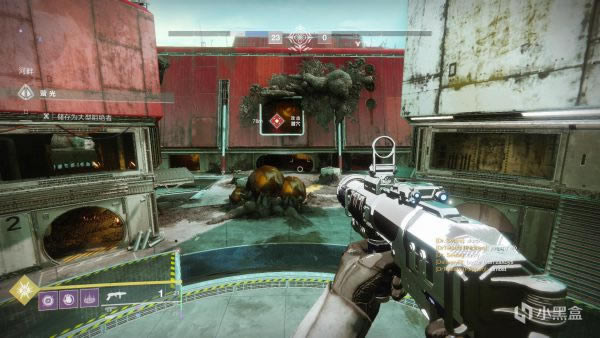 接下来说一下,如果你是从左面走传送带进入刷怪点建议从图示位置开始清怪。准星对准的这个位置会有一个黄血怪,还是直接1发山巅加上手雷秒掉就可以进到后面用土卫13清理小怪了,视角右面的怪留给队友,从左面进去绕着后面清一圈就可以出来去下一个刷怪点了。