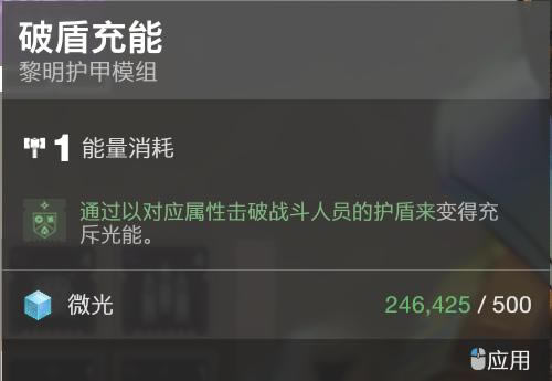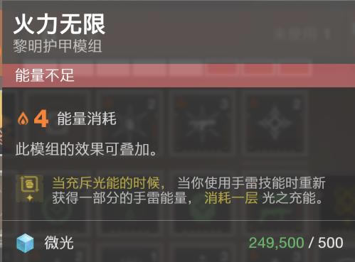 而完全充能这个模组,能让初始的两层充斥光能buff增加一层,让光能buff使用积累量更多。