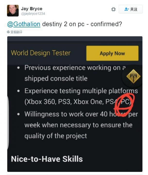 在推特上有网友晒出了Bungie招聘测试员的要求,其中就有在多平台测试的信息,平台包括Xbox 360、PS3、Xbox One、PS4和PC。