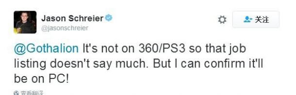 随后有人就此事询问外媒Kotaku的编辑Jason Schreier(他之前透露过许多关于《命运》的消息),Jason Schreier表示招聘广告没说清楚,游戏将不会登陆PS3和Xbox 360。但他可以确认,游戏将登陆PC。