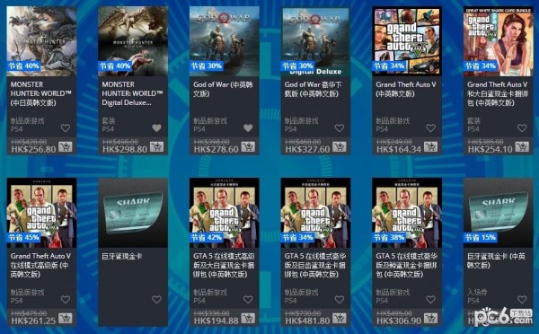 《怪物猎人:世界》节省40%,原价420港币,现价256.8港币(约合人民币224.4元),《战神4》节省30%,原价460港币,现在327港币(约人民币285元),《侠盗猎车5》节省34%,现价约143元。
