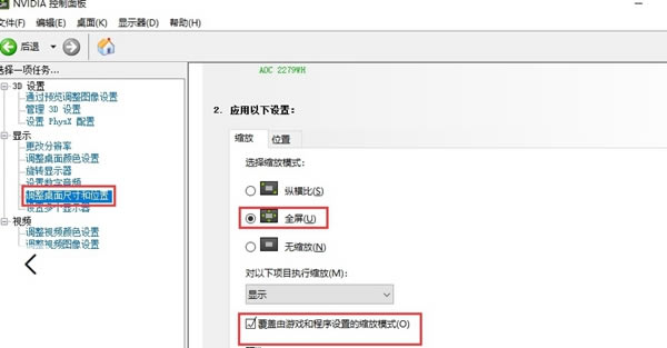 2.打开NVIDIA控制面板界面,在左侧菜单中找到“显示”一栏中的“调整桌面尺寸和位置”并点击选中它,然后在窗口右侧勾选“全屏”以及下面的“覆盖由游戏和程序设置值的缩放模式”就可以了。