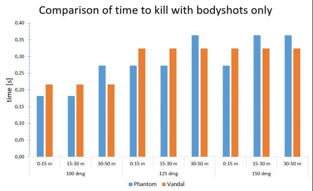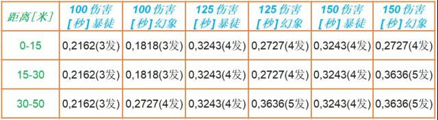 如果我们将图片内容转化为表格的话,具体数据则是如上图所示。这个数据是修正后的,计算了第一枪会延迟发射的情况,不会改变击杀所需时间的数值。在大部分情况下,无畏契约的枪战都是发生在20米以上的距离,因此,暴徒在很多情况下,都是玩家最合理的步枪选择。