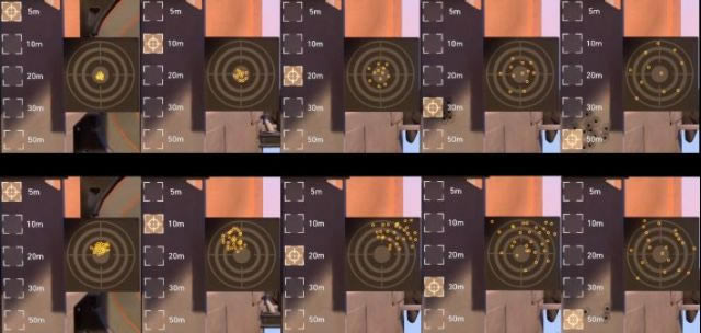 第一张图片是审判初始射击时的子弹扩散模式。而第二张图片,则是审判的第七次射击、也就是最后一次射击时的子弹扩散模式。
