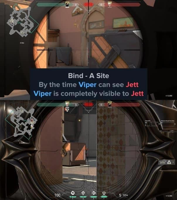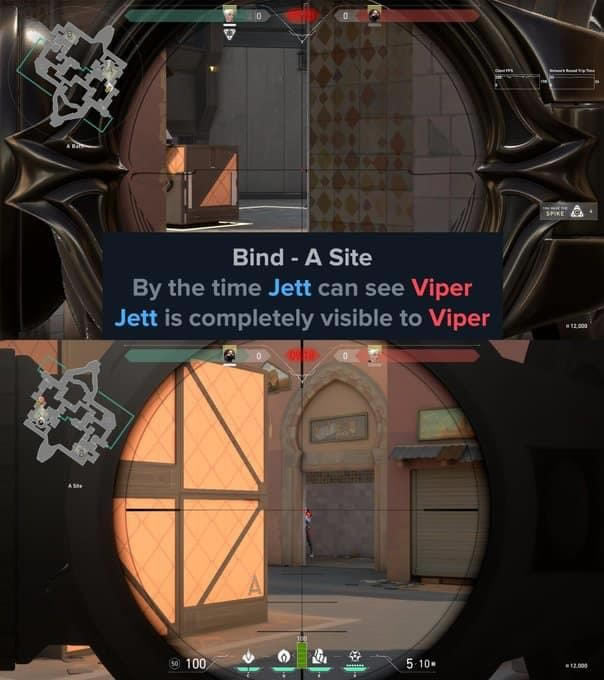 但因为Viper直接靠着墙,他的身体必须移动很多,才能「看到」Jett。
