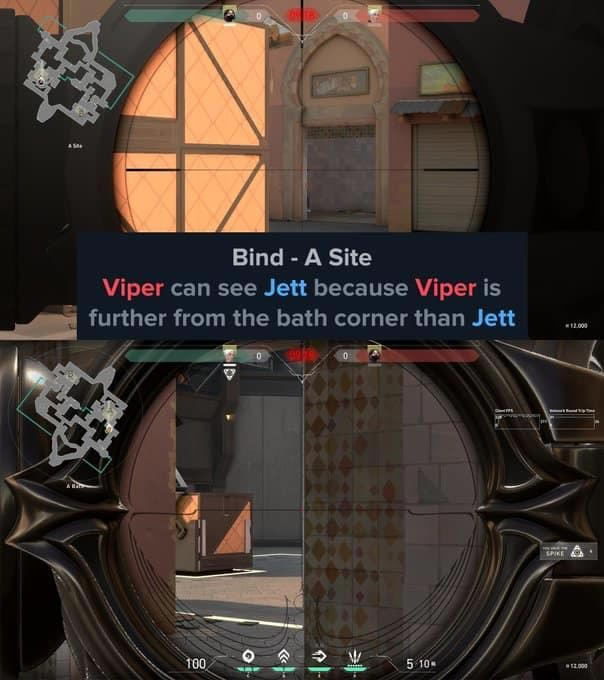 Viper因为贴著转角,所以要移动身体很大的距离才能看到Jett(远离转角)。届时,在Jett的视野里,Viper早就全身暴露。