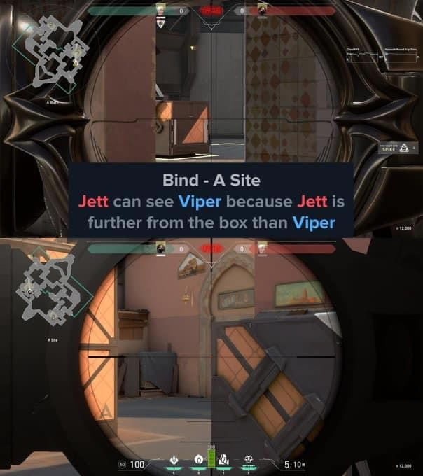 Jett可以先看到Viper,因为这次他离转角很远,只要移动一点,就可以看到看到外面包含箱子后的变化。但Viper离转角很近,直接贴著箱子,所以什么都看不到。他要移动很多距离,才能露出他的眼睛看外面。