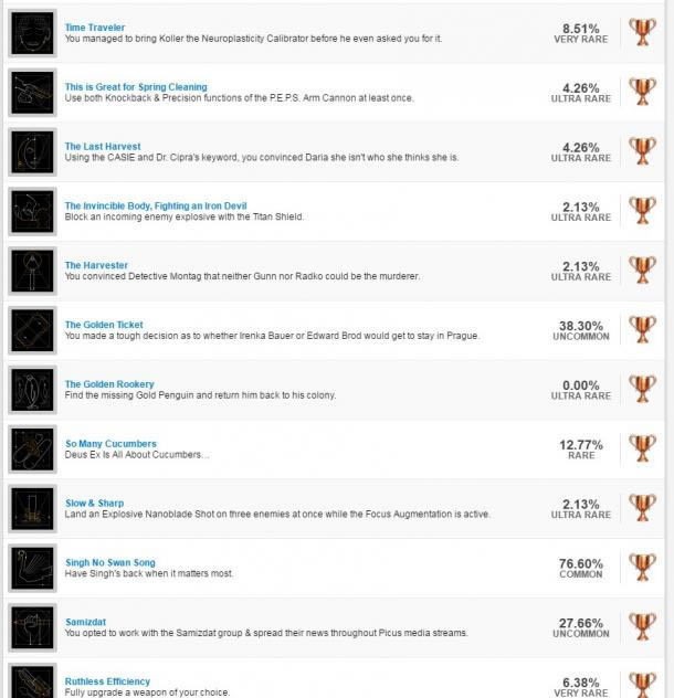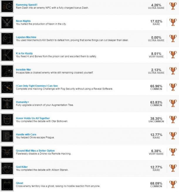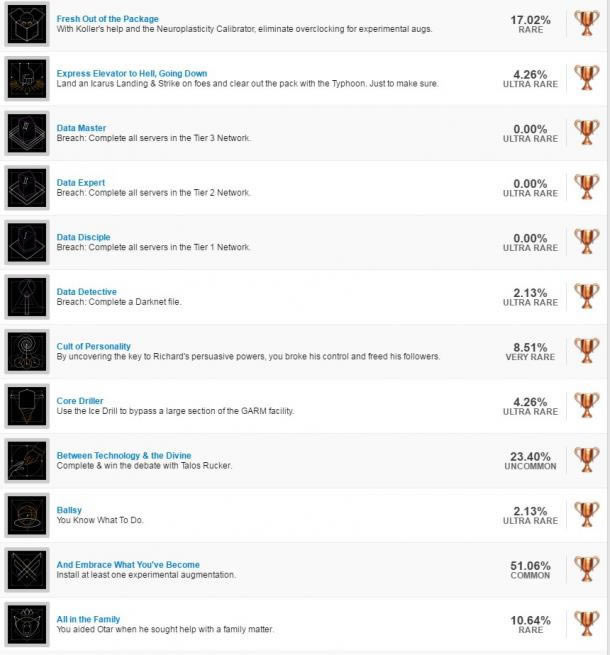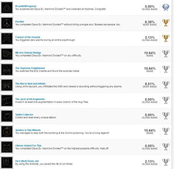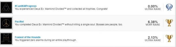 Profiles曝光了《杀出重围:人类分裂》的完整奖杯列表,游戏总共包含51个成就,玩家们如果想要获得白金奖杯就必须完成所有成就,其中包含不杀人通关并且不能触发警报。