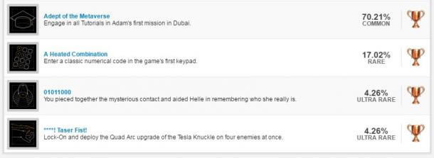 《杀出重围:人类分裂》的51个奖杯中,共含有1个白金奖杯,2个黄金奖杯,8个银奖杯以及40个铜奖杯。2个黄金奖杯分别对应两个成就: