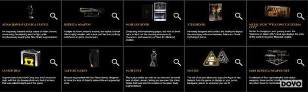 《杀出重围:人类分裂》自从在E3公布之后,玩家一直要求希望史威公布本作的收藏版本,或许这就是玩家对本作的热情过多,史威自然很乐意的公布了此次收藏版的内容,不过这些内容并不是集合在一起,而是通过玩家投票来决定:这些内容分别是:一个Adam Jensen手办,一把模型武器,一本迷你艺术画册,一套贴纸,午餐盒等等内容,如下图所示。投票时间将在7月3日结束。