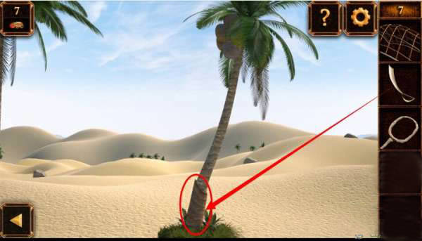 点击收集到的地图,注意上图小编用红色方框标记的地方,这是本关能否顺利过的关键!地图提示我们左边*颗椰子树的正对面有秘密,位置大概就是小编用红色箭头标记处,玩家可以用树皮在该处挖出一个地洞。