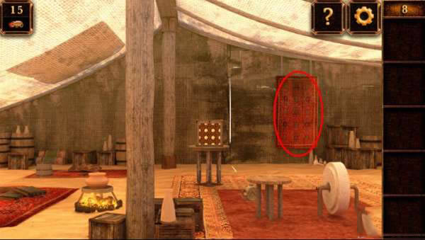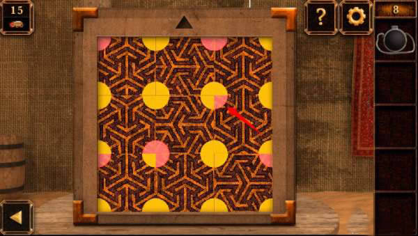 点击火堆旁的地毯,再看到一个图形,记住黄色扇形位置。