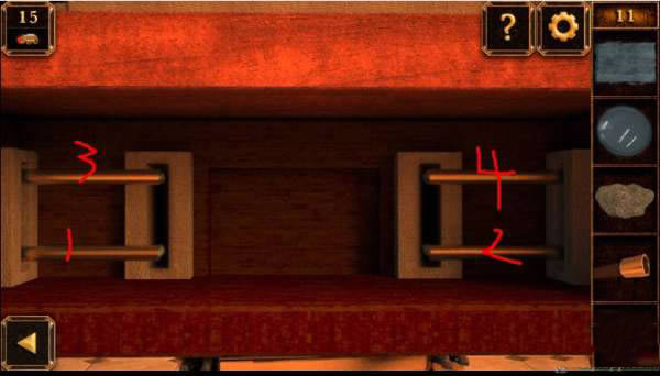 返回,点击右下角有图画的墙壁,看到一堆硬币,捡起。这时候请大家注意小编用红方框标记的画面,这很重要,一个图形表示二,一个图形表示七,请记住!