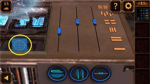 接着我们来到左上位置的驾驶台上,看到下方三个圆形按钮,按左中右右左中右左的顺序按动,左边圈内就会出现地球的坐标纸。