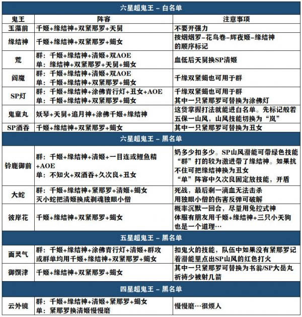 如果不为追求爆肝收益,碰到黑名单超鬼王,可以直接跳过不打。打的话下方表格也给出了阵容解法。大家可以直接存下来随用随查,属性配置上参考第三部分即可