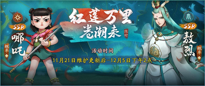 哪吒已于11月21日维护更新后,加入「红莲万里」妖灵卡池和「红莲万里」仅妖灵活动召唤池,并享有概率up!
