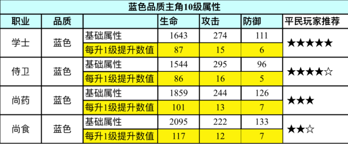 从图中官方给出的资料可以看出,侍卫类似于刺客,单体高暴击高输出,生命防御偏低,生存能力是四个职业里最弱的。学士输出仅次于侍卫,但是群体输出,防御生命略强于侍卫。尚药的生存能力较强,攻击一般,控制、减益敌方能力突出。