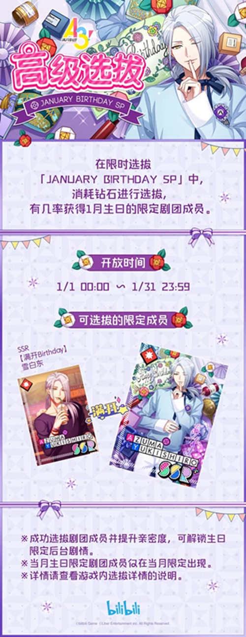 《A3满开剧团》限时选拔January Birthday SP将于1月1日0点开启!那么此次的活动都有哪些具体内容呢?下面,就跟随本站的小编一起来看一下吧!