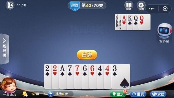 欢乐斗地主残局困难63关怎么过?微信欢乐斗地主残局闯关玩法困难模式的第63关手牌为22A7766443,本关的玩法比较简单,同样是利用对牌最后压尾来过掉,对手只有五张牌是最大的劣势,下面就让我们一起来看下,小程序欢乐斗地主困难残局第63关攻略。